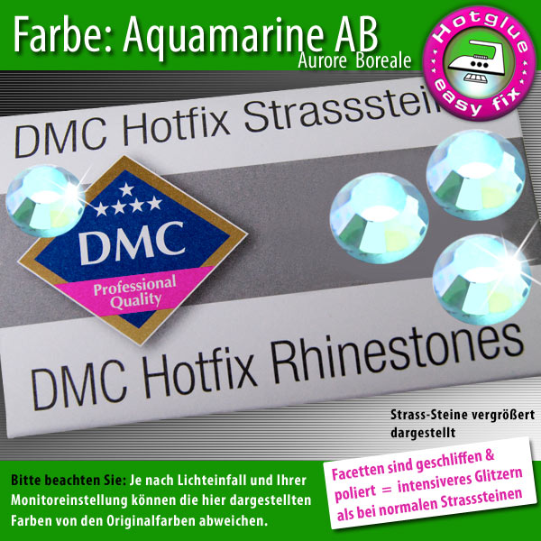 Größe: SS6 = ca. 2,8 mm Farbe: Aquamarine AB (Aurore Boreale) Facettenzahl: 8
