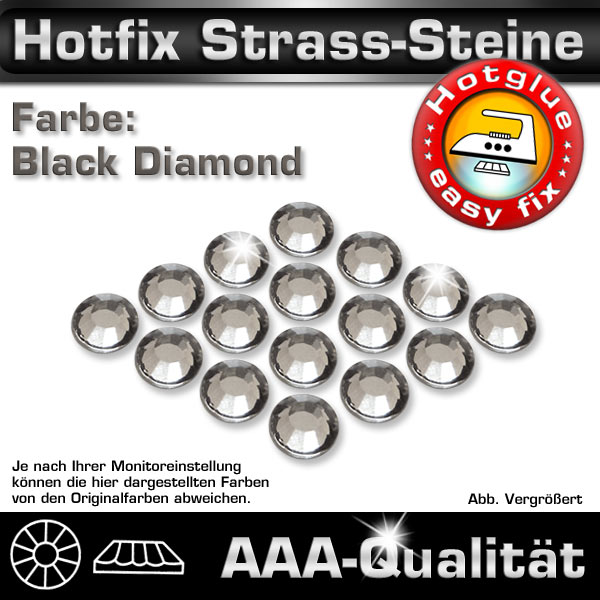 Größe: SS20 = ca. 4,8 mm Farbe: Grau (Black Diamond) Material: Glas Facettenzahl: 12 Fertigung: gepresst - Ober- und Unterseite geschliffen (2 cut