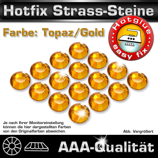 Größe: SS20 = ca. 4,8 mm Farbe: Topaz (Goldbraun) Material: Glas Facettenzahl: 12 Fertigung: gepresst - Ober- und Unterseite geschliffen (2 cut)