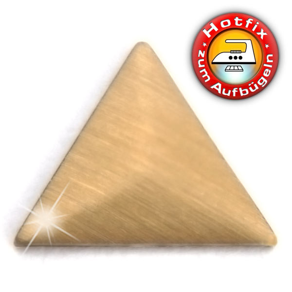 Größe (Seitenlänge x Höhe): 6 x 1 mm Farbe: Gold matt Form: Dreieck spitz Material: Aluminium Ausführung: Hotfix, zum Aufbügeln